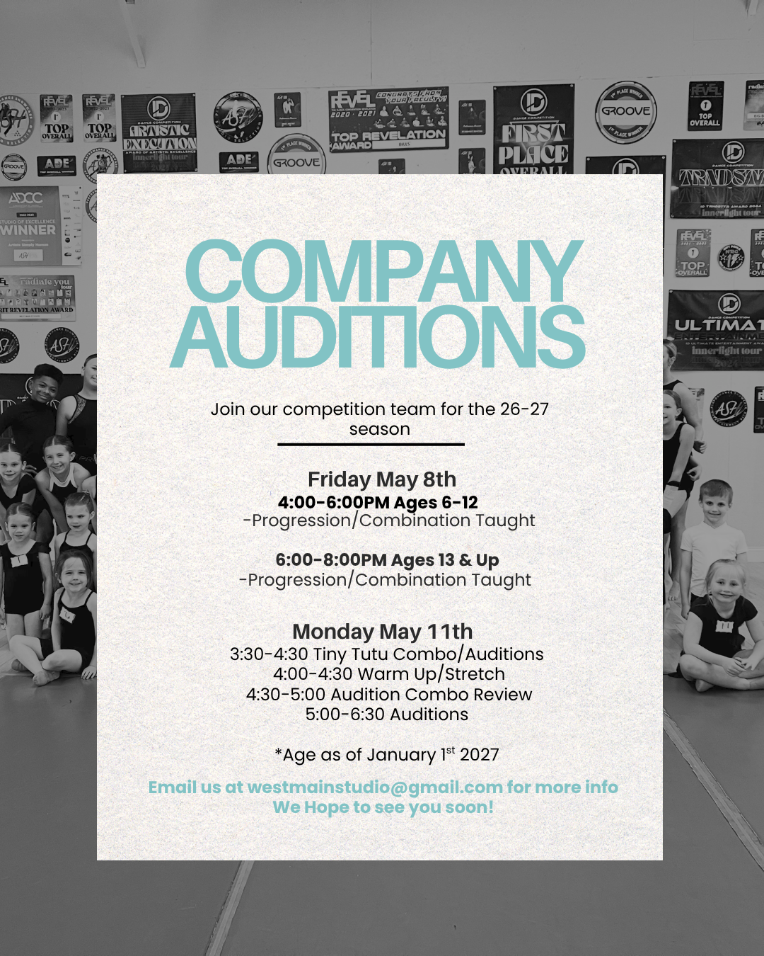 West Main Studios Company Dancers are selected by West Main Studios’ teachers and guest judges through an annual audition process.