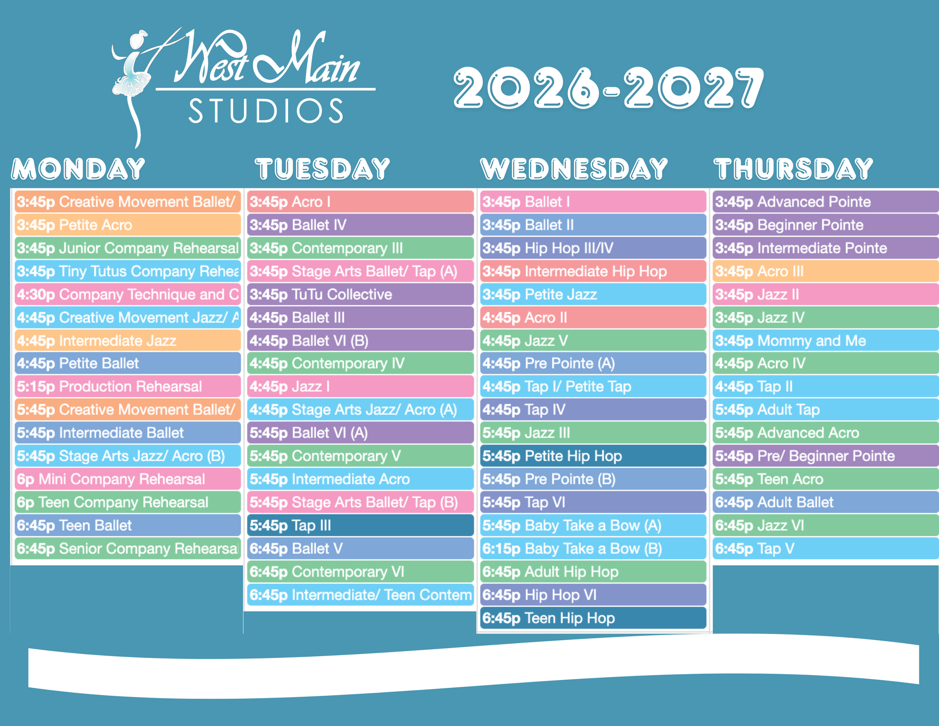 West Main Studios offers a full curriculum in all dance genres'. Established in 1996, our program includes Ballet,Tap, Jazz, Contemporary, Hip Hop and Acrobatics. We strive to provide continuing education in the performing arts, with the highest quality of dance instructors while conducive to a family like atmosphere. It is our goal and wish for all of our students to excel not only in their chosen discipline but in life. Teaching a common thread of respect for one another, while building self-esteem and bonds with life-long friends.